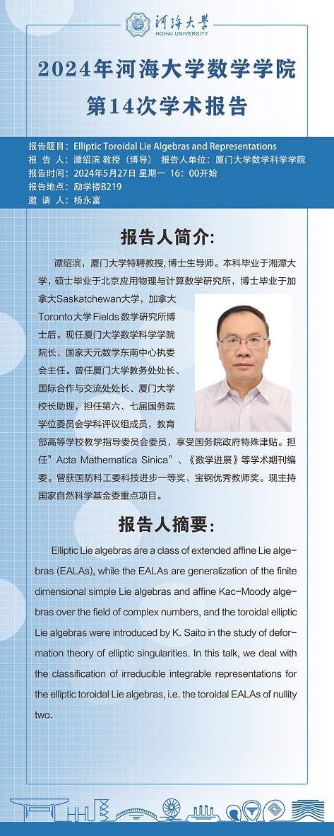 Bwin官网第14次学术报告:Elliptic Toroidal Lie Algebras and Representations