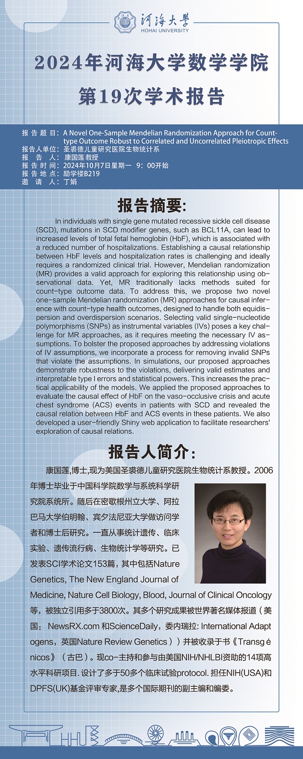 Bwin官网第19次学术报告:A Novel One-Sample Mendelian Randomization Approach for Count-type Outcome Robust to Correlated and Uncorrelated Pleiotropic Effects
